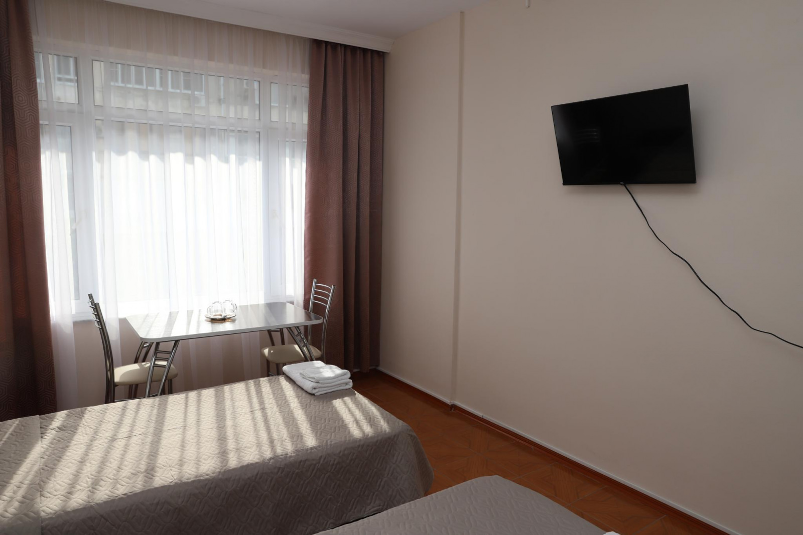 Номер оснащен смарт-телевизором и Wi-Fi. В спальне есть две отдельные кровати, которые обеспечат вам комфортный и спокойный сон. Фен, кондиционер и чайник также входят в комплектацию номера, чтобы ваше пребывание было максимально комфортным.